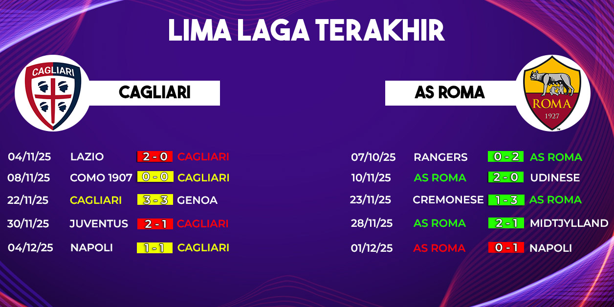 Pertandingan antara Cagliari vs AS Roma pada pekan ke-14 Serie A 2025/2026 dipastikan menjadi salah satu duel paling menarik yang digelar akhir pekan ini. Laga yang berlangsung di Unipol Domus tersebut akan kick-off pada Minggu, 7 Desember 2025 pukul 21.00 WIB, dan dapat disaksikan melalui live streaming di Vidio. Dengan kondisi kedua tim yang berada pada situasi berbeda, bentrokan ini menyajikan cerita besar tentang ambisi, tekanan, dan perjuangan untuk bangkit.