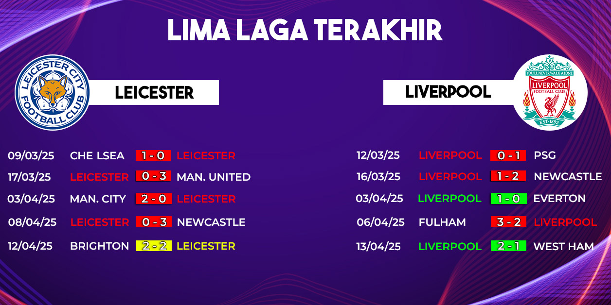 Pertandingan seru akan tersaji di pekan ke-33 Premier League 2024/2025 saat Leicester City menjamu Liverpool di King Power Stadium. Laga Leicester City vs Liverpool dijadwalkan berlangsung pada pukul 22.30 WIB dapat disaksikan melalui layanan live streaming Vidio. Kedua tim datang dengan motivasi tinggi dan kepentingan berbeda: Leicester berjuang menghindari degradasi, sementara Liverpool memburu gelar juara.