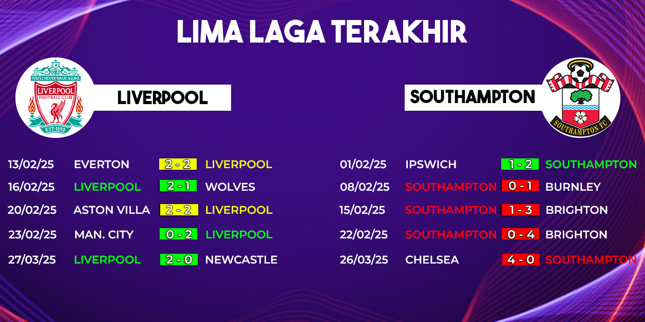 Liverpool memiliki catatan positif dalam pertemuan dengan Southampton. Dalam 49 pertemuan terakhir, Liverpool memenangkan 27 pertandingan, sementara Southampton memenangkan 11 pertandingan, dan 11 pertandingan berakhir imbang.